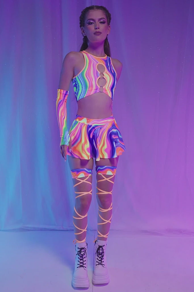 Electrify your rave game in this rainbow set, featuring a daring crop top with ring cut-outs, flirty mini skirt shorts, matching arm warmers, and fierce leg wraps. Stretchy, breathable, and built for endless dancing—this festival wear is your passport to unapologetic freedom and next-level self-expression.