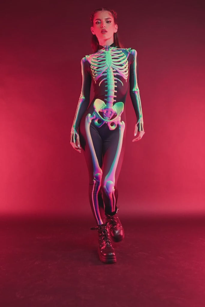Light up the night with the Toxic Skeleton women's costume! This UV-reactive suit glows in neon hues, giving u that bold, electrifying look. With a sleek front zipper and form-fitting design, it’s built for those who want to stand out. Complete the look by adding the matching balaclava for an extra layer of intensity and enhance the costume’s rebellious vibe!