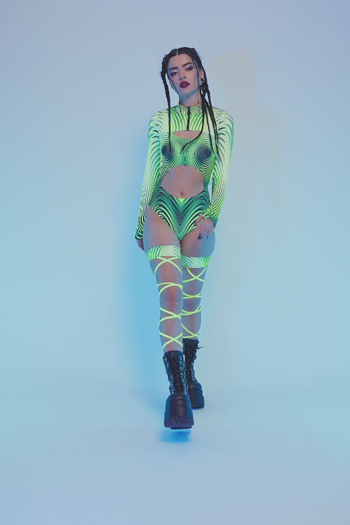 This 2 piece bodysuit features a high-cut base with a front cut-out and a matching bolero shrug top. The hypnotic green wave print shapes the body, while the sculpted fit keeps the silhouette sharp. Stretchy, striking, and built for full trance energy. Neon criss-cross leg wraps - adjustable, lightweight, and made to amplify the full look.