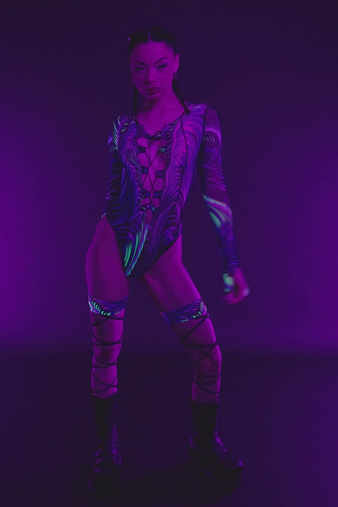 Slip into visual sorcery with this lace-up front bodysuit, dripping in hypnotic neon waves of violet, yellow, cyan, and hot pink. The curve-sculpting cut and deep plunge give u celestial confidence, built for bass drops and stares. This rave outfit isn’t subtle—it’s straight-up spellbinding.