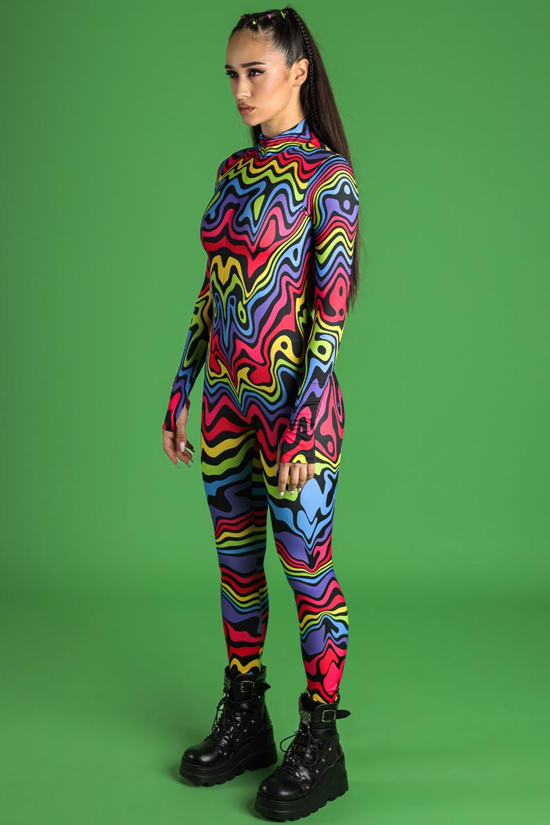 Unleash your inner spirit with this vibrant women's costume, perfect for pride events, raves, and festive celebrations. Featuring the eye-catching Trippy Stripes design, this costume boasts a form-fitting silhouette that highlights your curves. The costume has a high neckline and zips up the front, ensuring a secure and comfortable fit. The long sleeves extend to the wrists, adding an elegant touch to this bold ensemble. Designed to celebrate individuality and pride, this piece is a standout addition to any festival wardrobe.