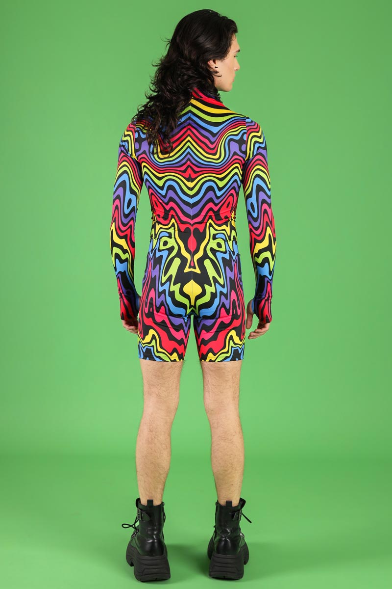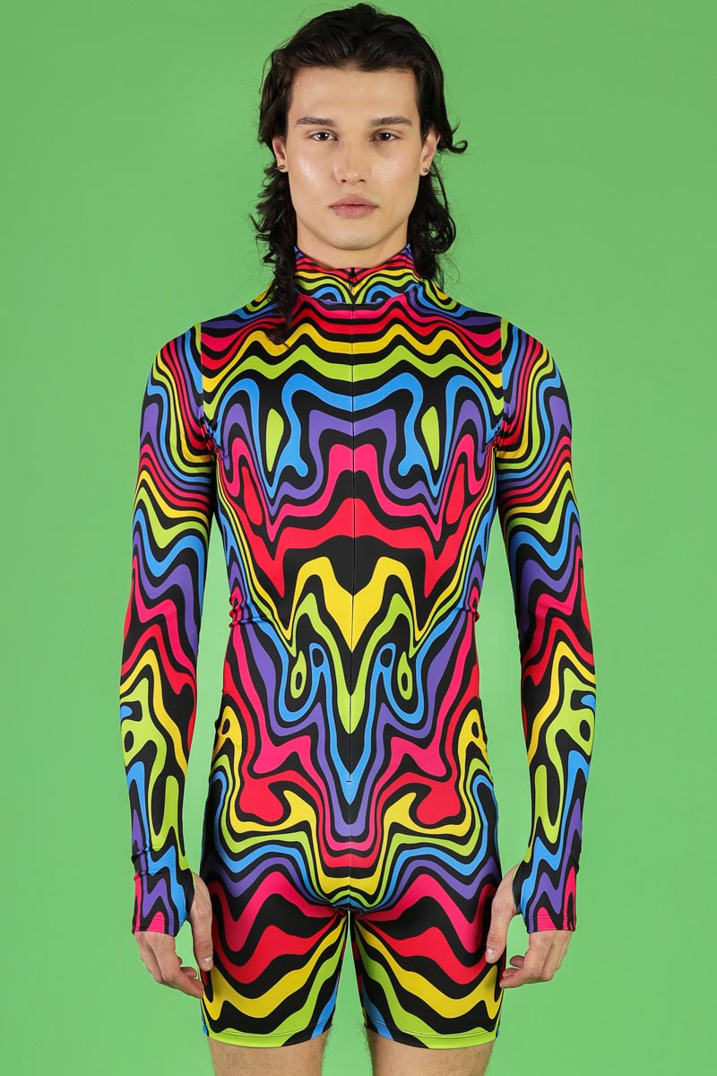 Upgrade your festival attire with this vibrant men's romper, perfect for pride events, raves, and other festivals. Featuring the eye-catching Trippy Stripes design, this romper showcases a high neckline and front zipper for easy fastening. The long sleeves and shorts combination provides a striking and comfortable fit, ensuring you stand out in any crowd. Part of our pride collection, this romper celebrates individuality and bold fashion statements, making it a must-have for your festive wardrobe.