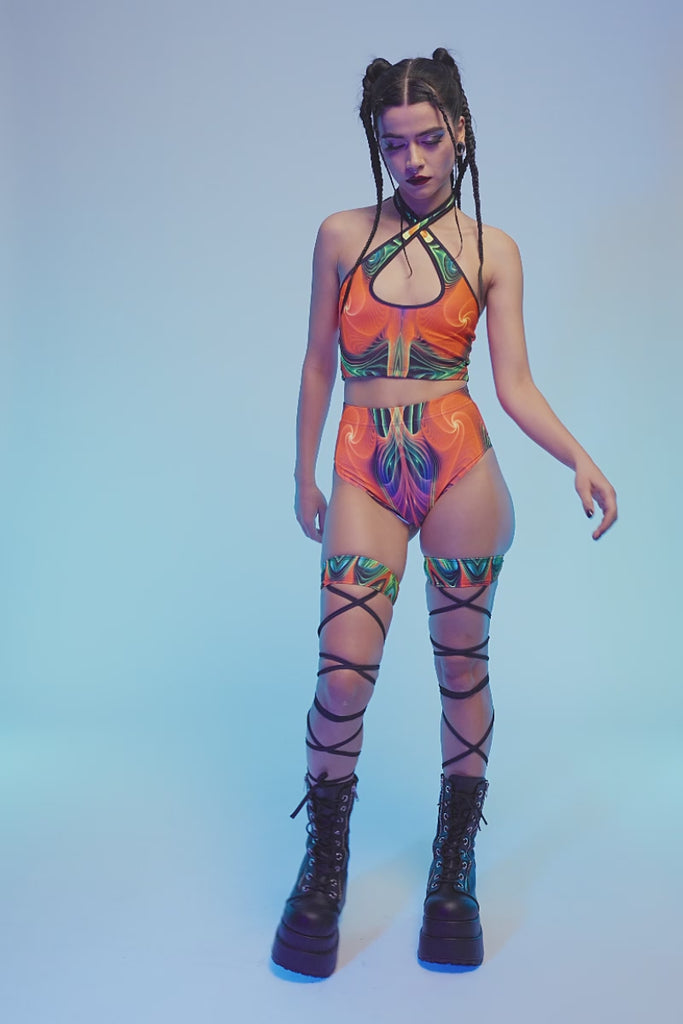 This criss-cross halter top features a bold wrap design with a striking front cut that highlights your shape. The close fit follows your curves, while the vibrant tropical print brings instant heat. Supportive, flexible, and made to stand out.