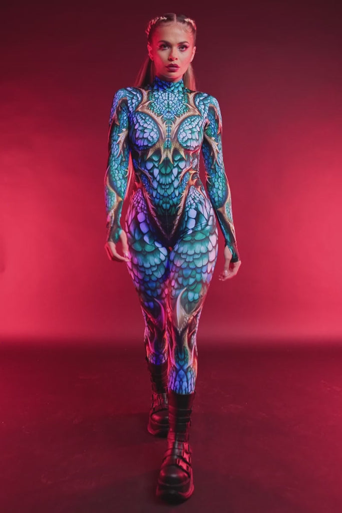 Command the night in the Verdant Dragon costume! With a sleek front zipper and high neckline, this bold piece glows under UV light. Vibrant scales and edgy detailing take your look to the next level. Wanna stand out? This costume’s got u covered. Perfect for owning the Halloween scene with fierce, fearless style.