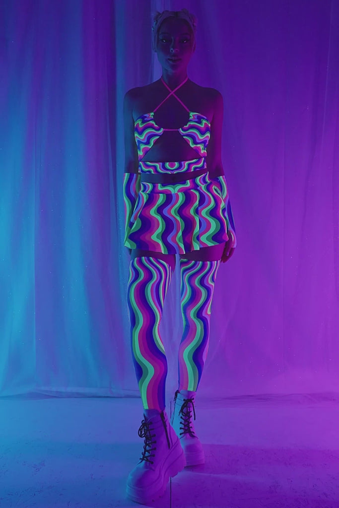 Step into your spotlight in this fierce rainbow set—featuring a cheeky v-string crop top, rave mini skirt, bold leg wraps, and matching arm warmers in a wavy pastel print that screams main character energy. Stretchy, breathable, and built to move, this is festival wear with zero apologies.