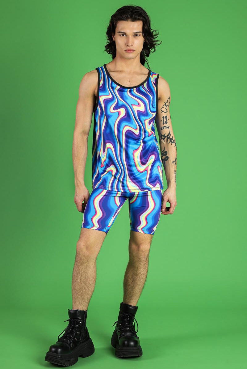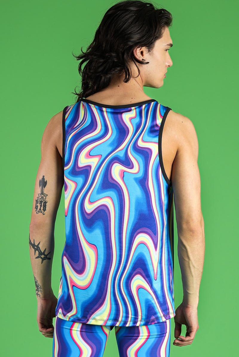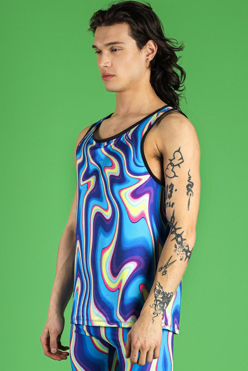 Experience vibrant style with this men's tank top featuring the striking Wavy Wonders pattern. The sleeveless design and relaxed fit ensure comfort and freedom of movement, perfect for any energetic event. The tank top features a classic scoop neckline, providing a casual yet bold look. Crafted from breathable, high-quality fabric, it is both lightweight and durable, making it ideal for outdoor festivities, pride celebrations, or raves. Stand out and express your unique style with this eye-catching piece.