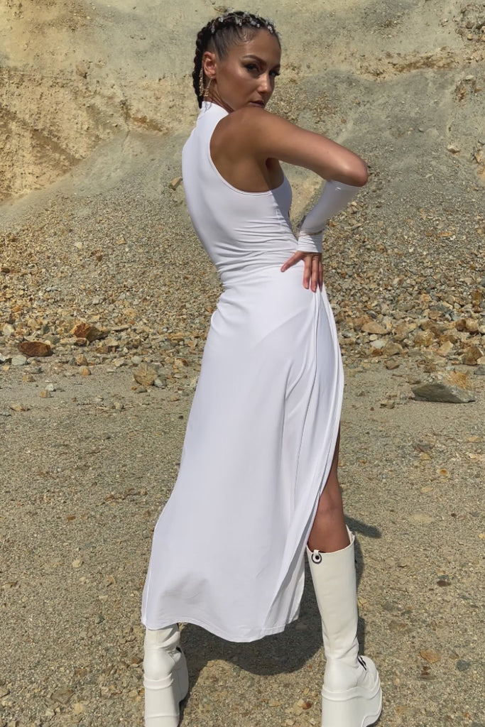 Command the scene with this fierce maxi dress. Featuring a sleek zipper closure at the front, this dress has a high neckline and striking cut-out details that show just the right amount of skin. The flowing maxi skirt with high slits creates a dramatic, head-turning silhouette, perfect for expressing your bold style.