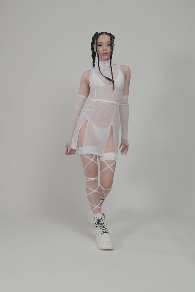 This hooded slit mini dress features sheer white mesh with a lightweight, layered look. The hooded neckline adds edge, while side slits allow easy movement. Matching arm warmers and leg wraps complete the dress, adding structure and detail for a fully styled, standout look. Own the moment.