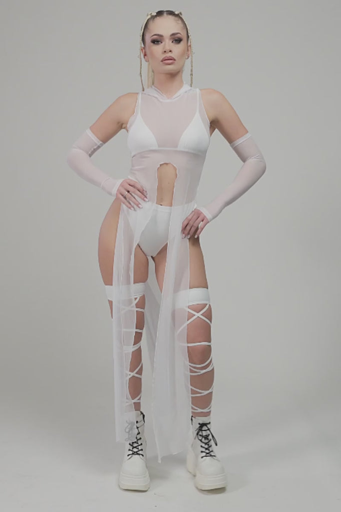 This mesh hooded tunic dress is made from sheer white fabric with a lightweight, flowing feel. The hooded neckline adds edge, while the long front slit creates clean movement as you walk. Designed to layer easily, it delivers an airy, statement-making slit maxi dress look. Move freely.